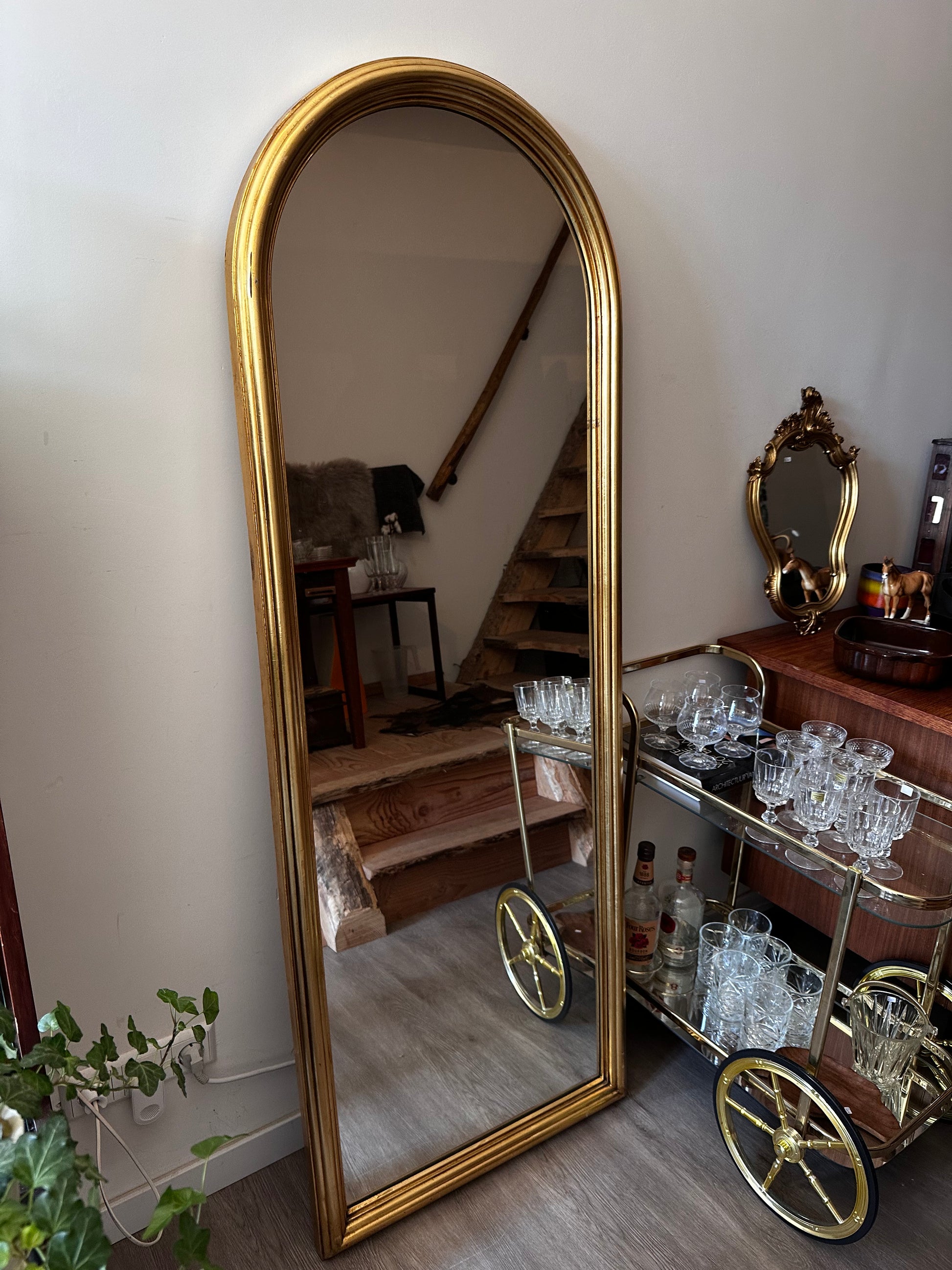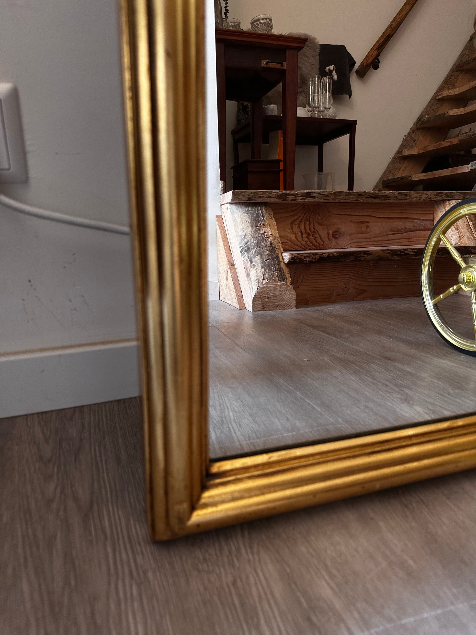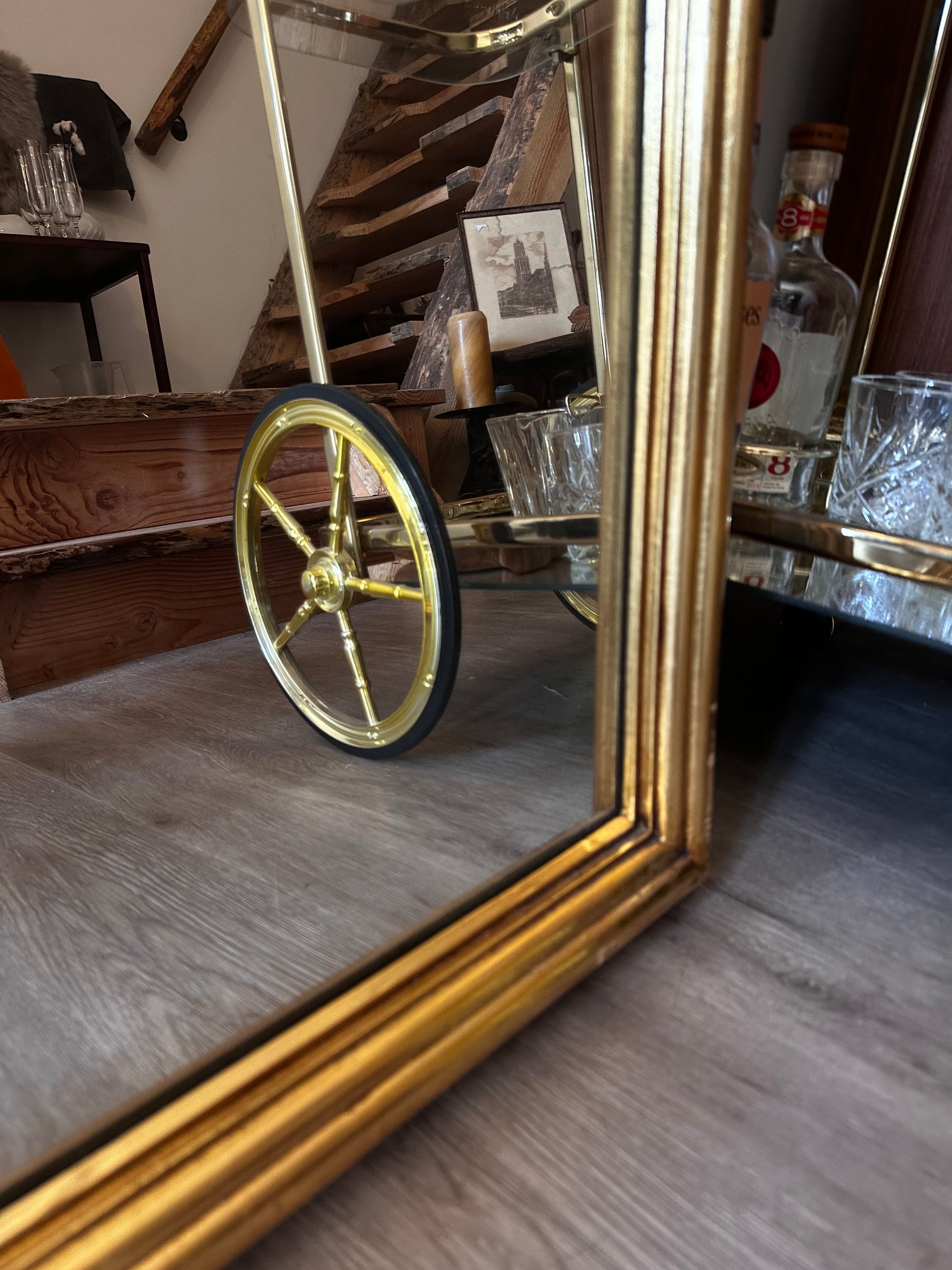 Stoere spiegel uit de jaren 80 , met een stevige goudkleurige omlijsting en een flink formaat. Het is een zwaar model dat mooi leunt tegen de muur of kan worden opgehangen. In mooie staat met hier en daar lichte gebruikssporen. Q156