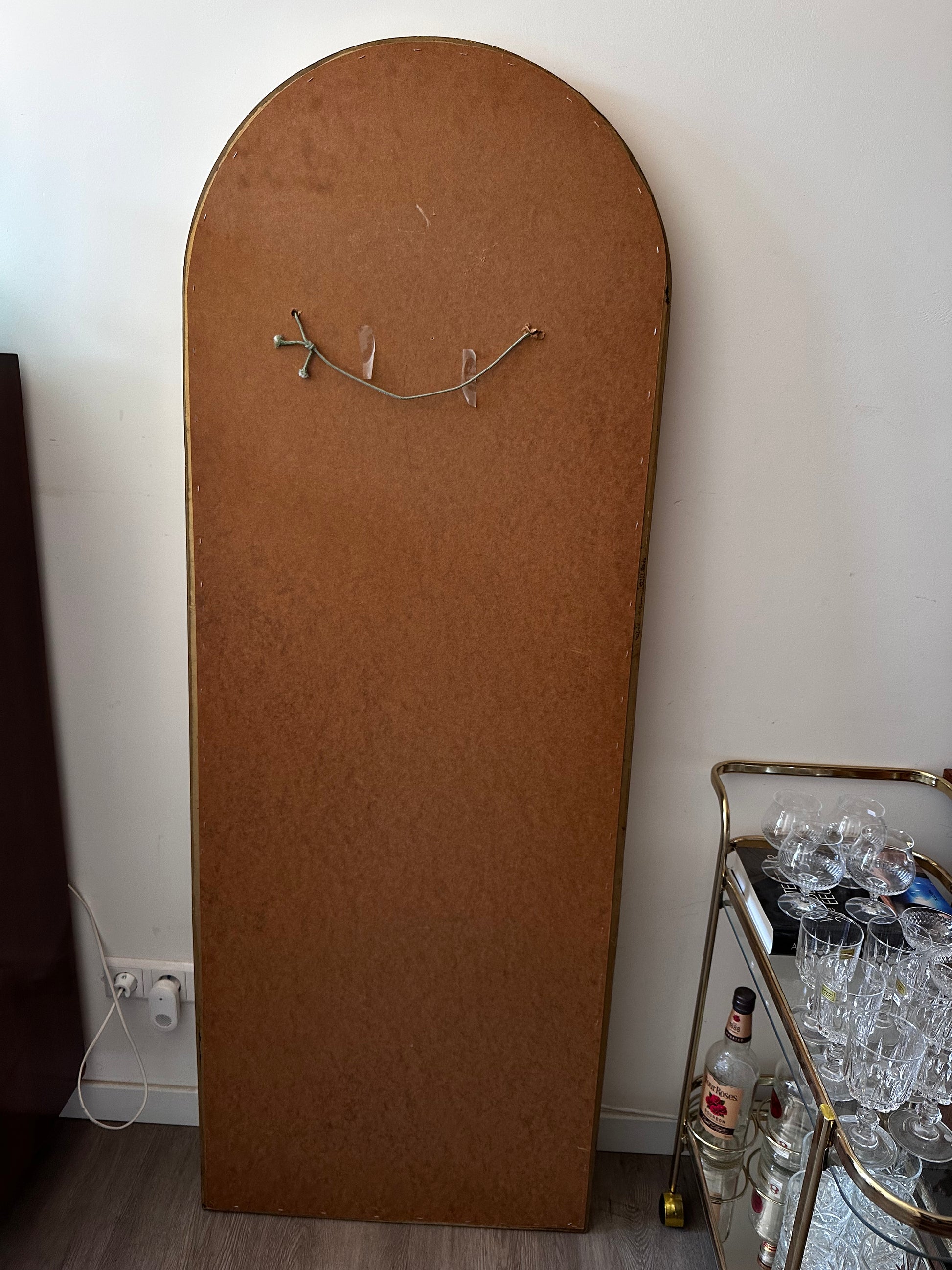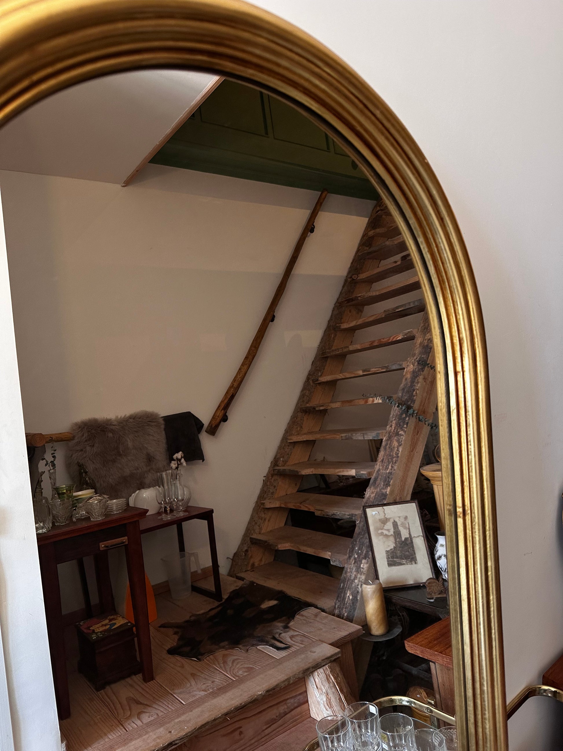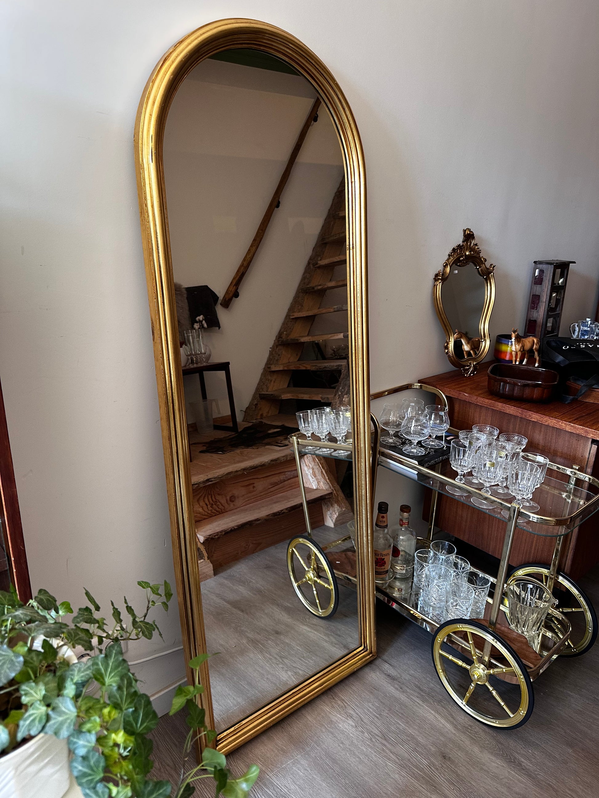 Stoere spiegel uit de jaren 80 , met een stevige goudkleurige omlijsting en een flink formaat. Het is een zwaar model dat mooi leunt tegen de muur of kan worden opgehangen. In mooie staat met hier en daar lichte gebruikssporen. Q156