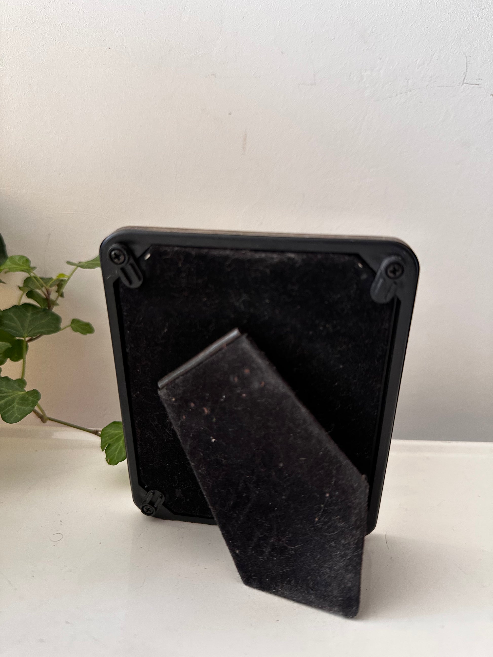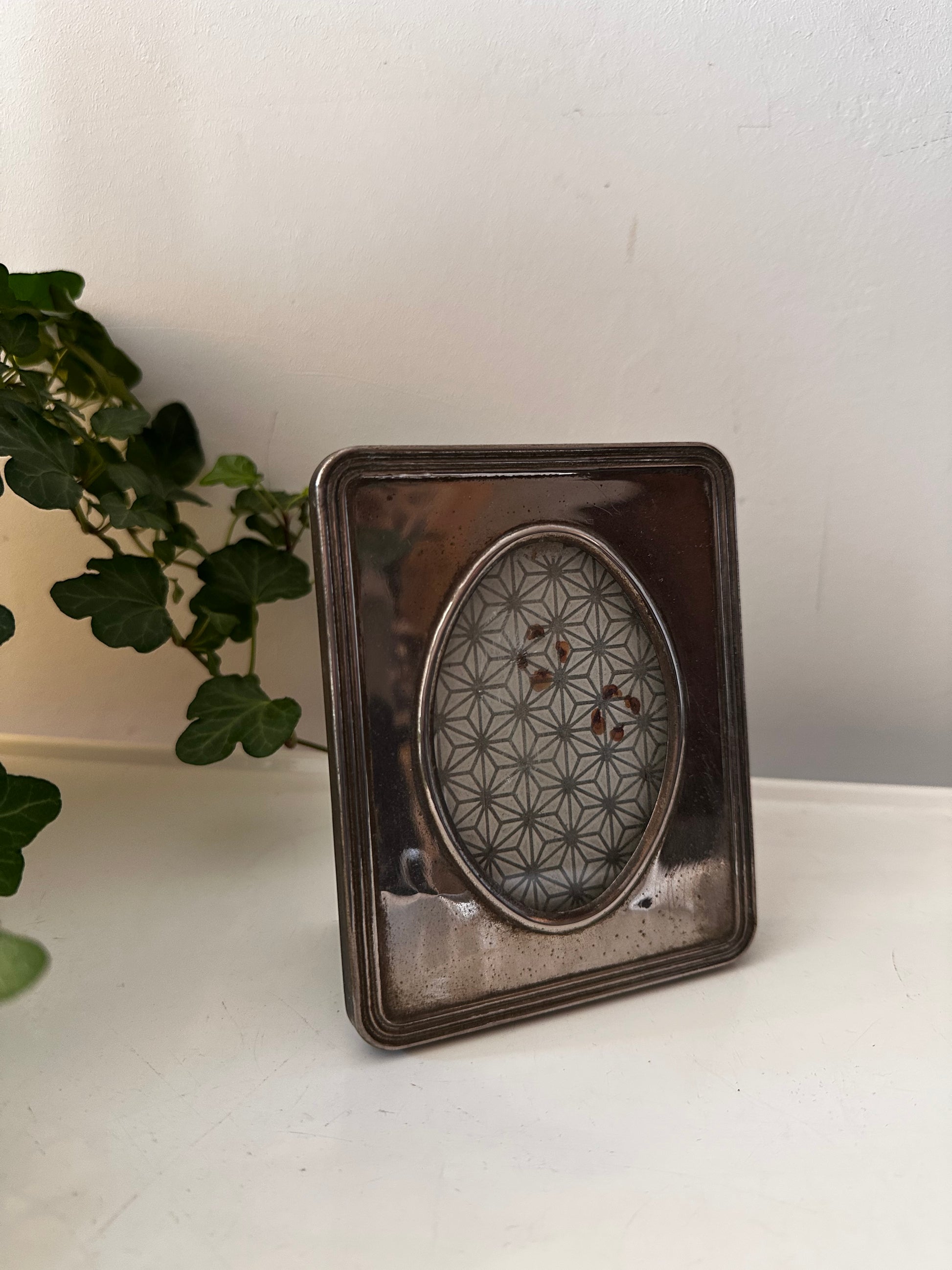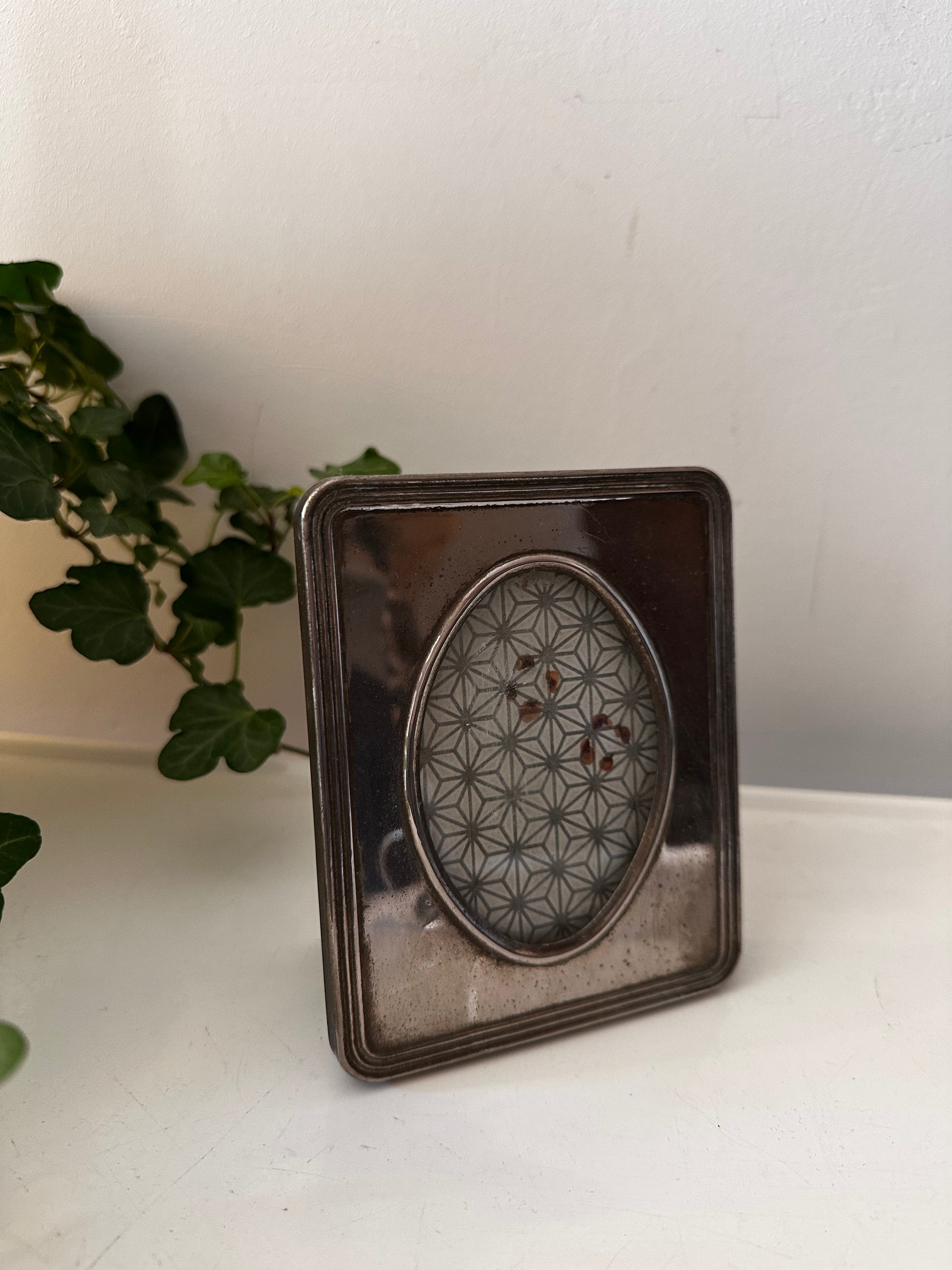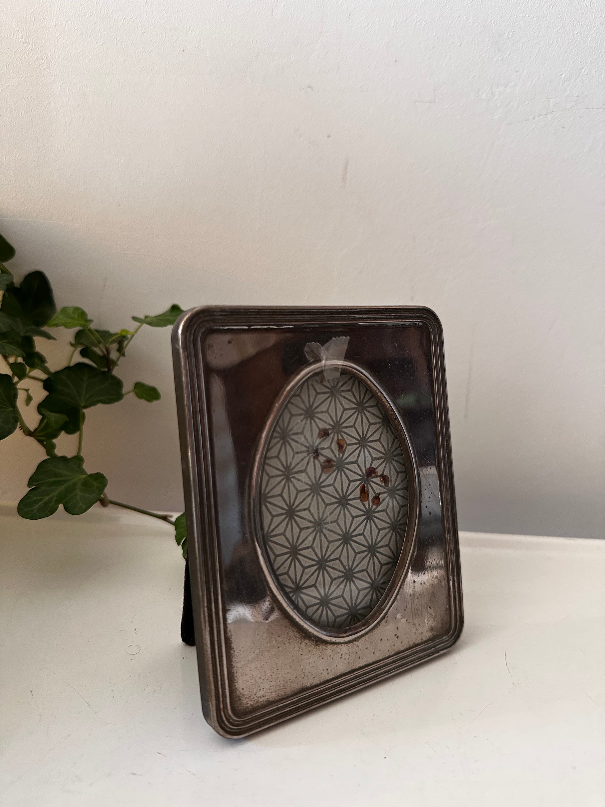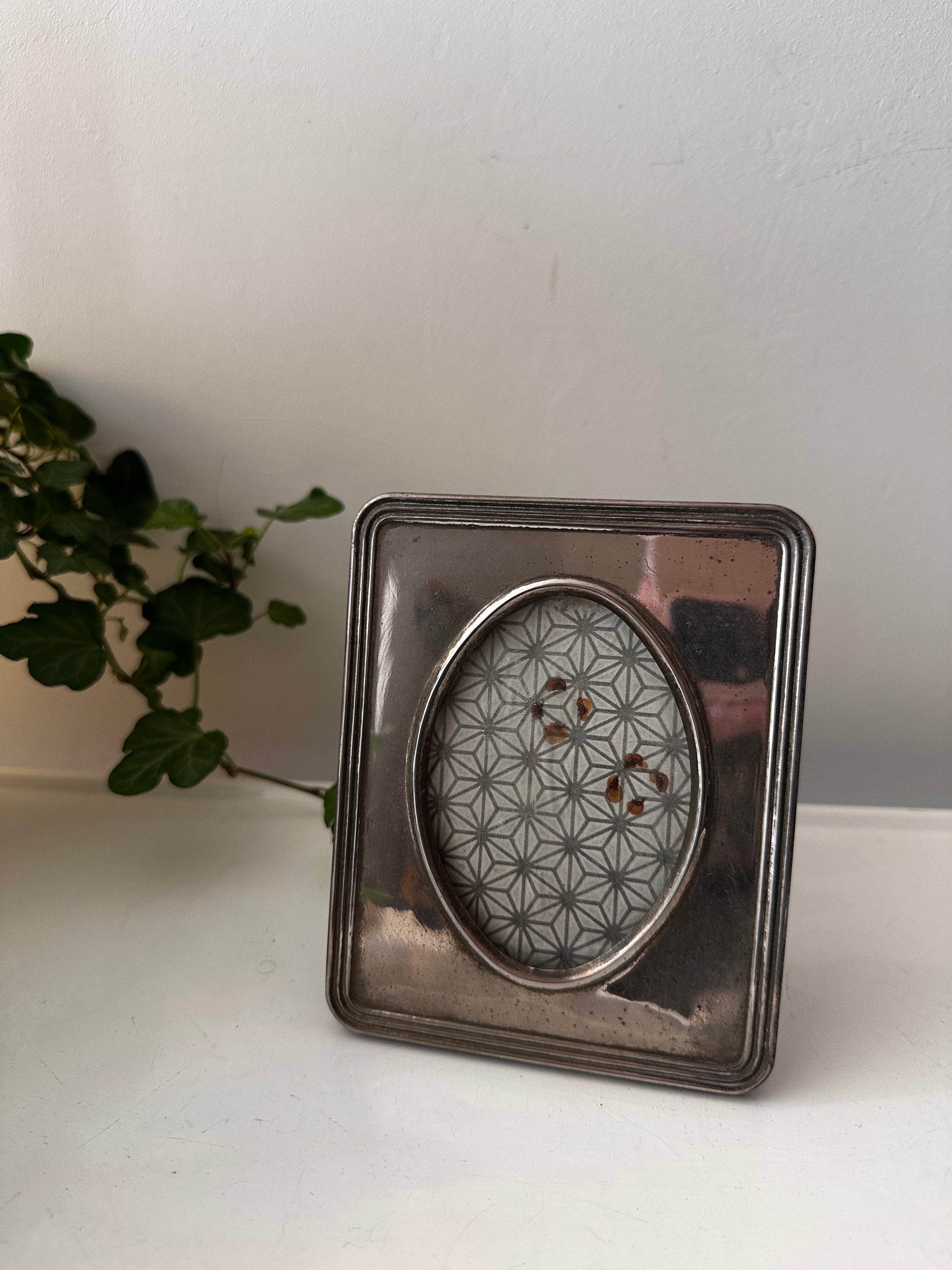 Top vintage fotolijstje met een zilverkleurige omlijsting en een patina look. Het lijstje heeft een ovale venster. Het lijstje heeft een voetje achter. Q781