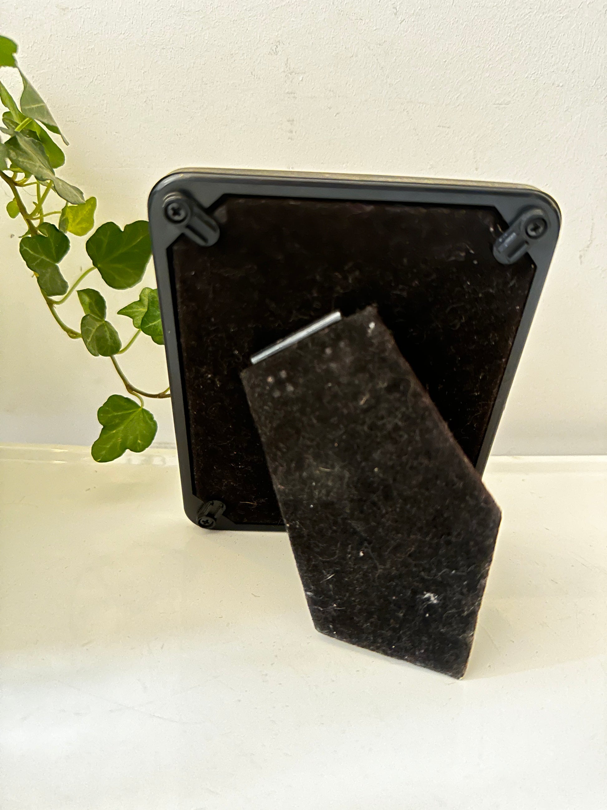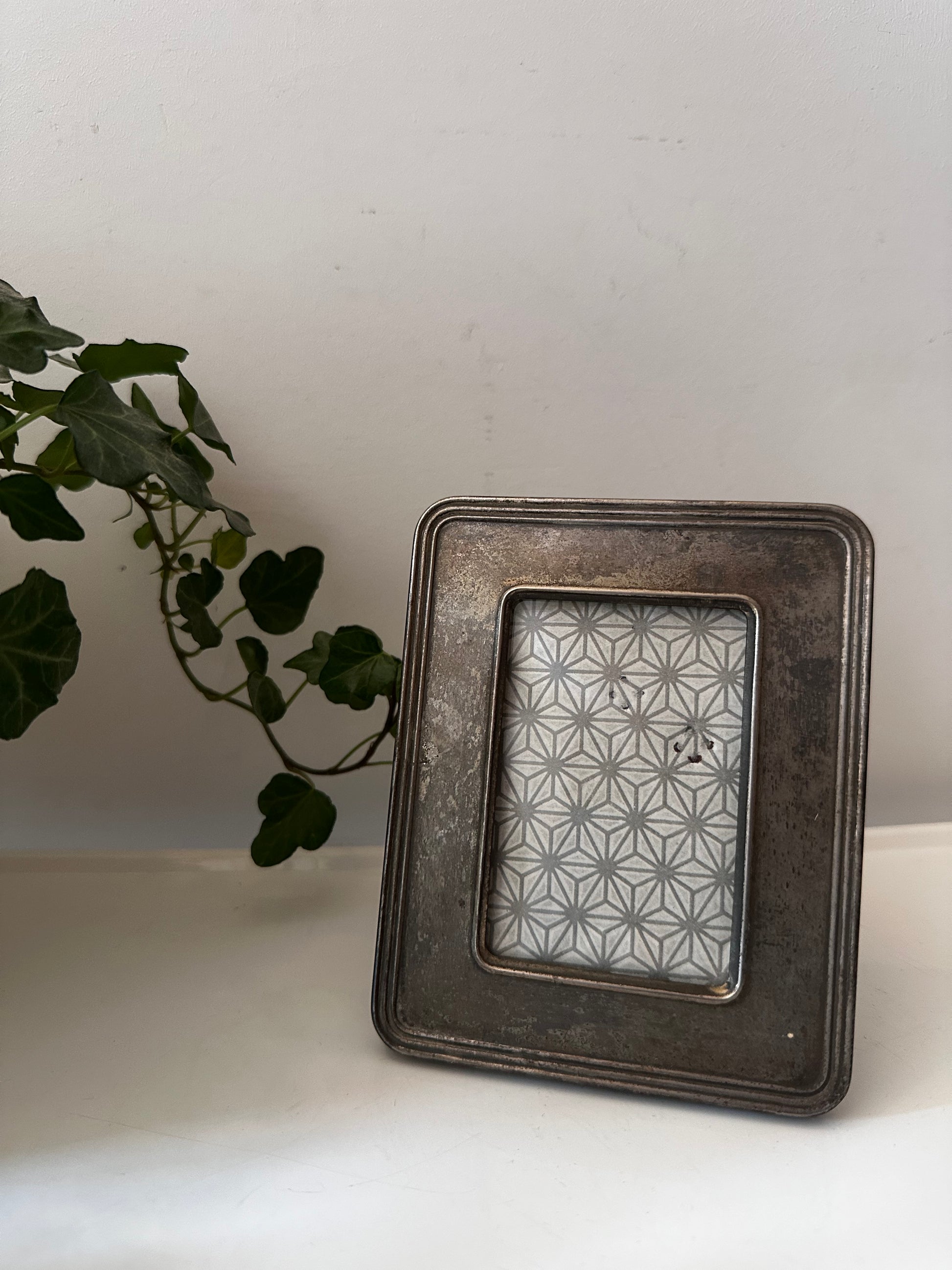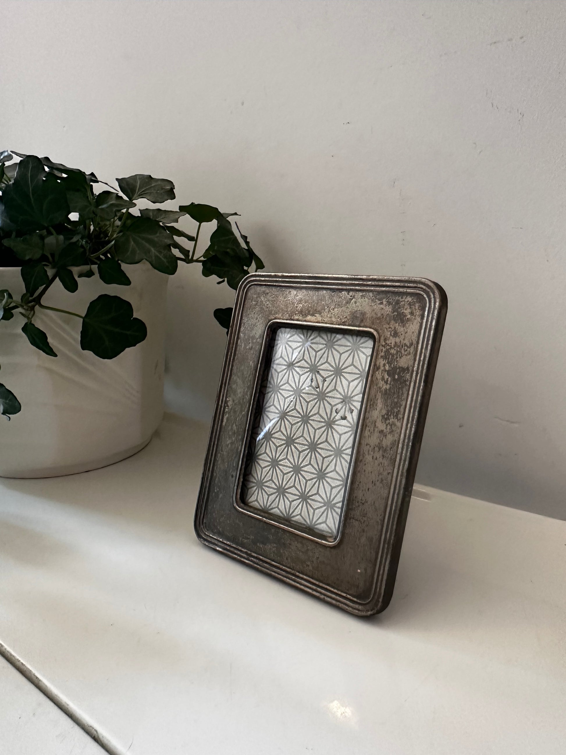 Sfeervol klein fotolijstje met een mooi verweerd metalen frame. Tijdloos model met een subtiel reliëfrandje — past mooi op een dressoir, plankje of nachtkastje. Achterkant is bekleed met zwart vilt en voorzien van standaard.