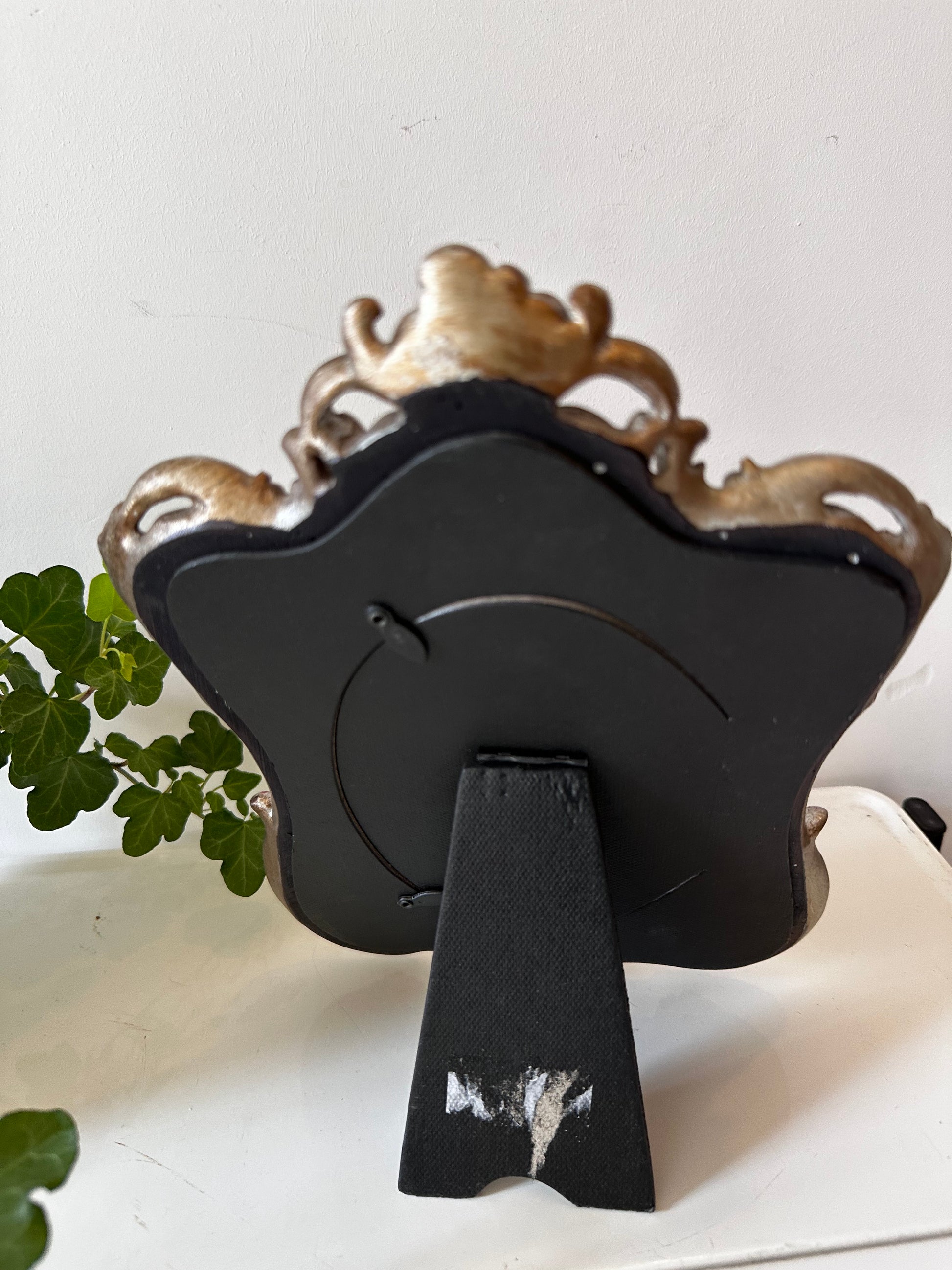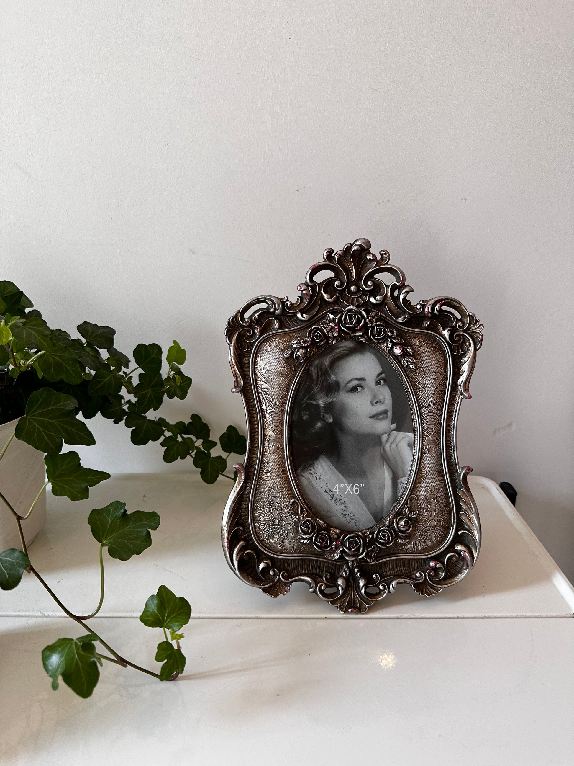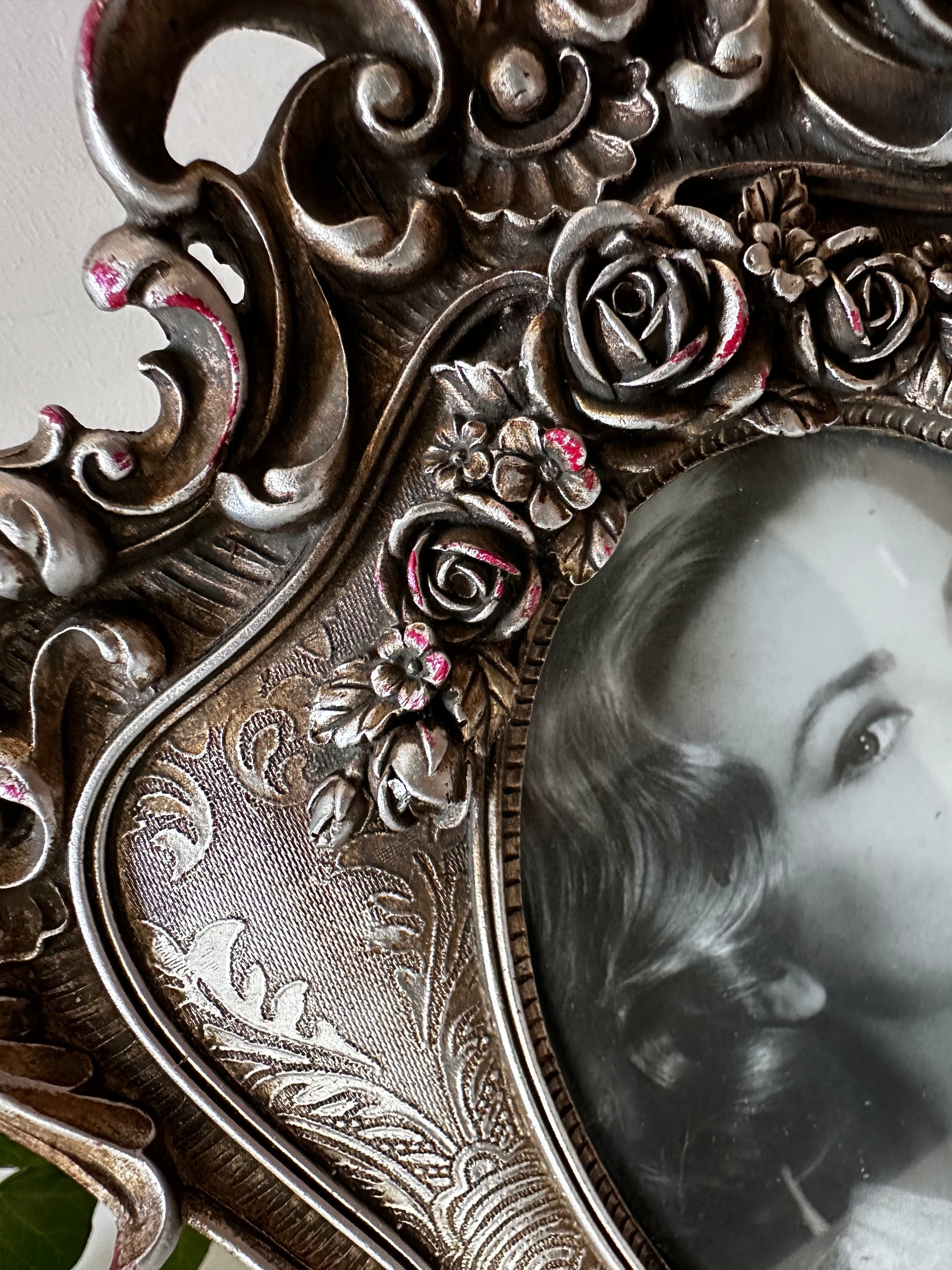 Heel tof fotolijstje. Lijstje heeft een romantische uitstraling en een zilveren kleur.