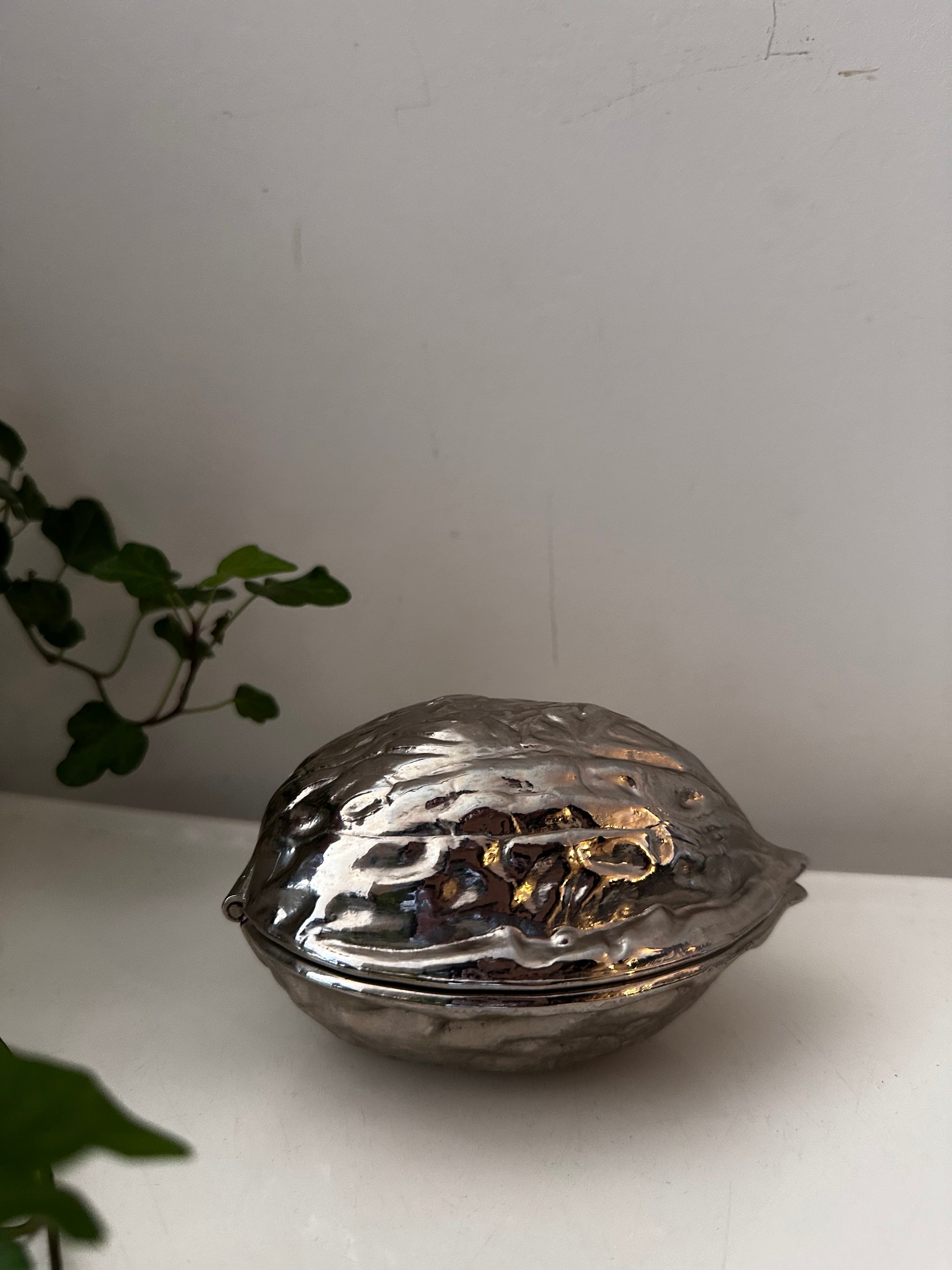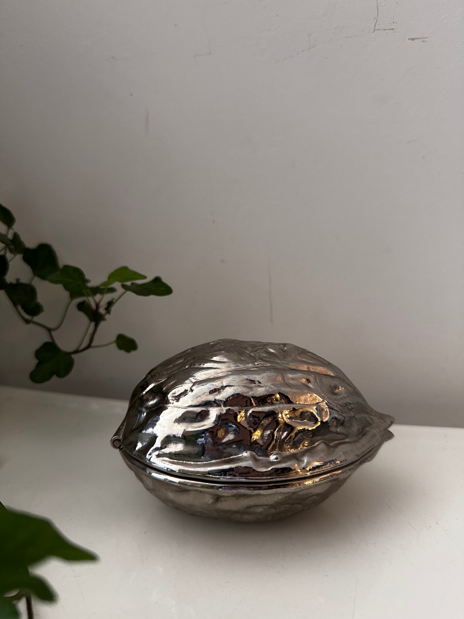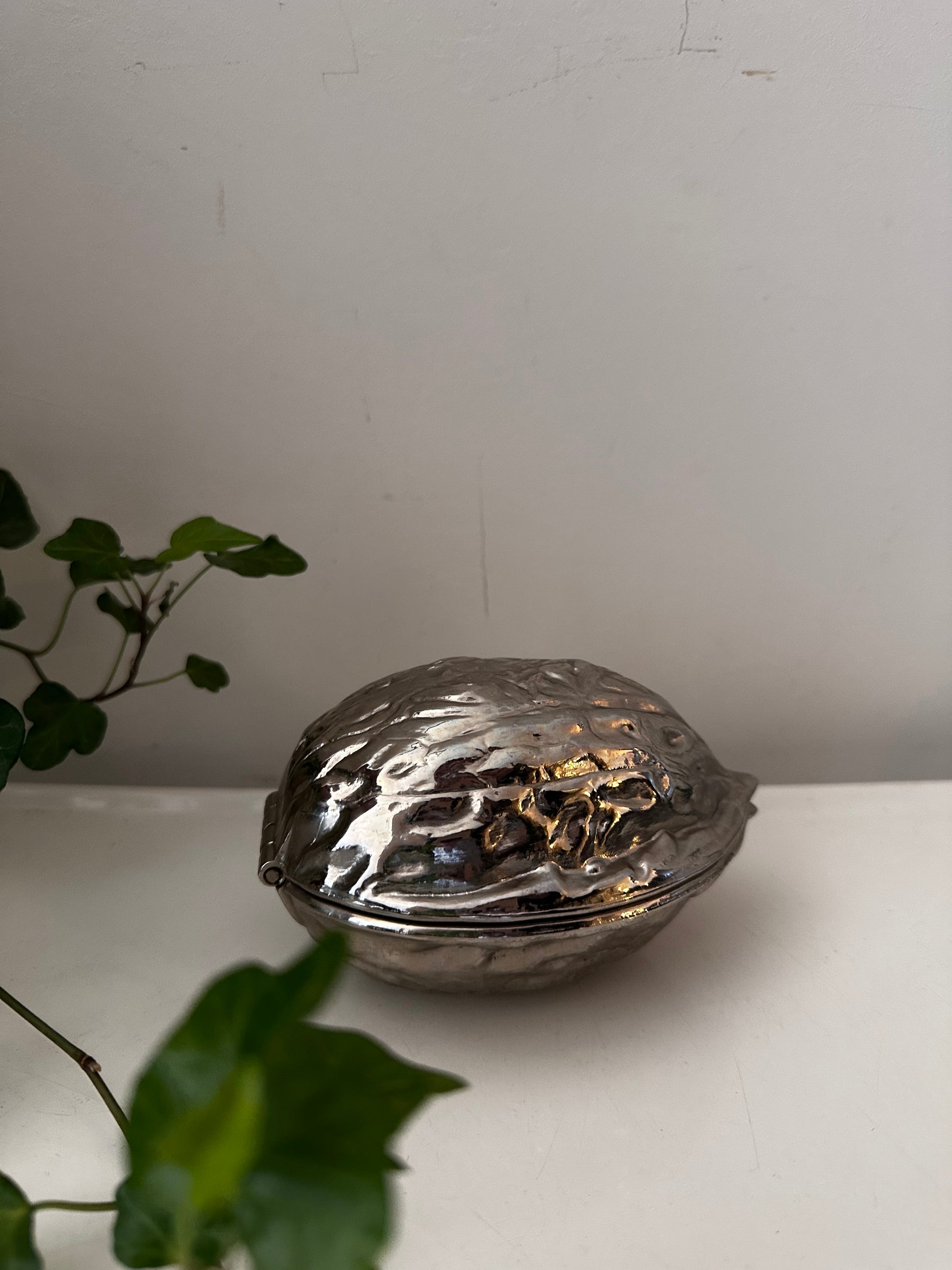 Hoe cool is deze? Een vintage notenkraker uit de jaren 70 in de vorm van een walnoot. Zilverkleurig met glanzende finish en een scharnierende opening. Hij is nog in een geweldige vintage staat. Q790